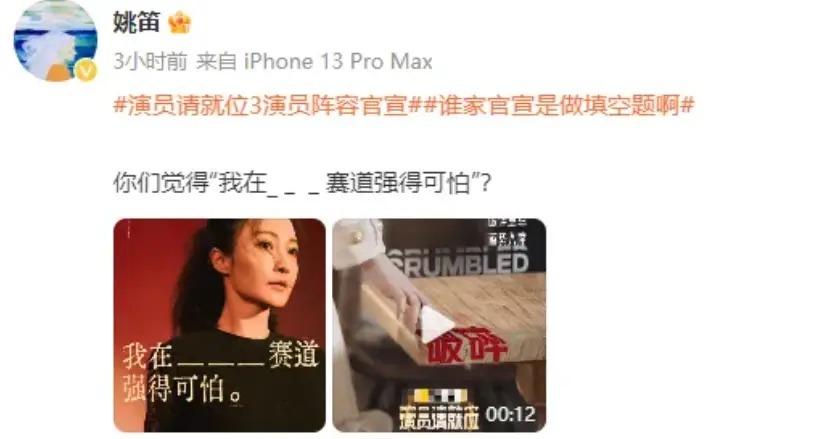 2月13日,姚笛还出席了《演员请就位》第三季的发布会,更被推选为本季节目 “最值得期待的演员” 之一,当时大家都对她的复出充满期待,认为她或许能在节目中实现人生的触底反弹。